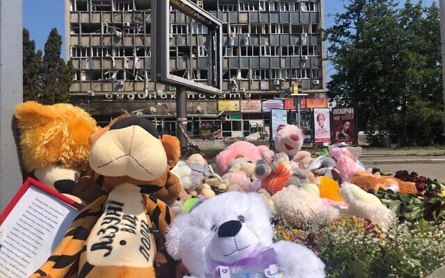 A makeshift memorial at the site of a deadly Russian rocket attack in Vinnytsia, Ukraine, July 2022 (Lazar Berman/The Times of Israel)