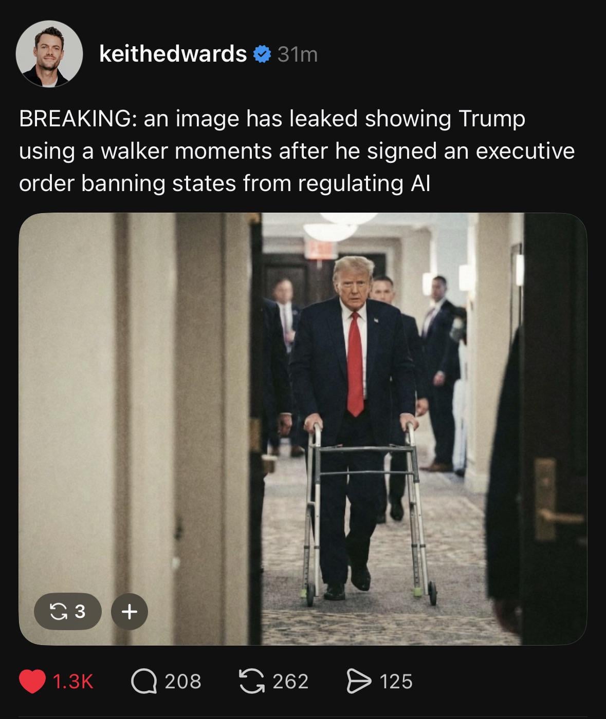 Seriously? Some people can’t see the ironic humor of posting an obvious AI pic after Trump championing banning AI regulation in the PoliticalHumor sub?