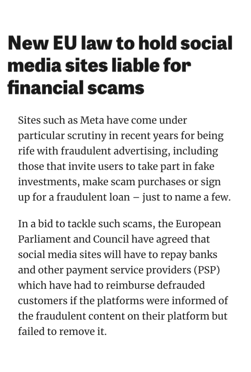 ŠOK! Nový návrh Evropské unie navrhuje, že online platformy budou zodpovědné za scam reklamy. Podvedení budou mít právo na vrácení peněz bankou, ty budou moct škodu vymáhat po poskytovateli reklamy.
