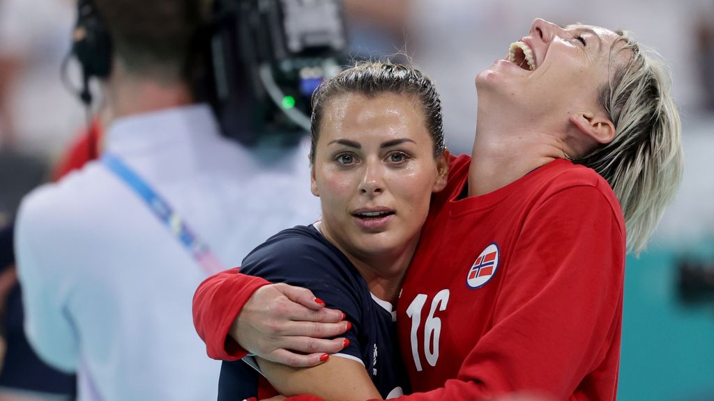 ANPNora Mørk (links) en Katrine Lunde na het winnen van olympisch goud in Parijs.