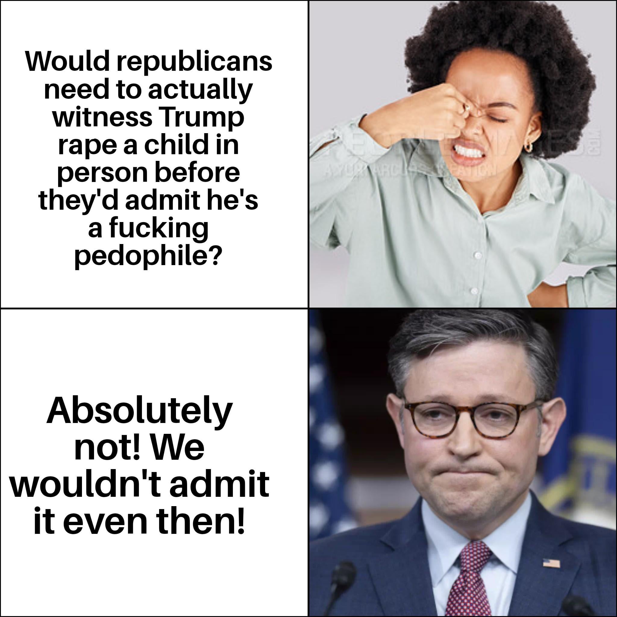 THE ONLY way ANY republican would raise hell was IF THE UNDER-AGE GIRL, OR BOY, WAS THEIR OWN!!! BUT that ain’t gonna happen because all the congressmen and women ARE TOO DAMNED OLD to have under-aged kids!!!!