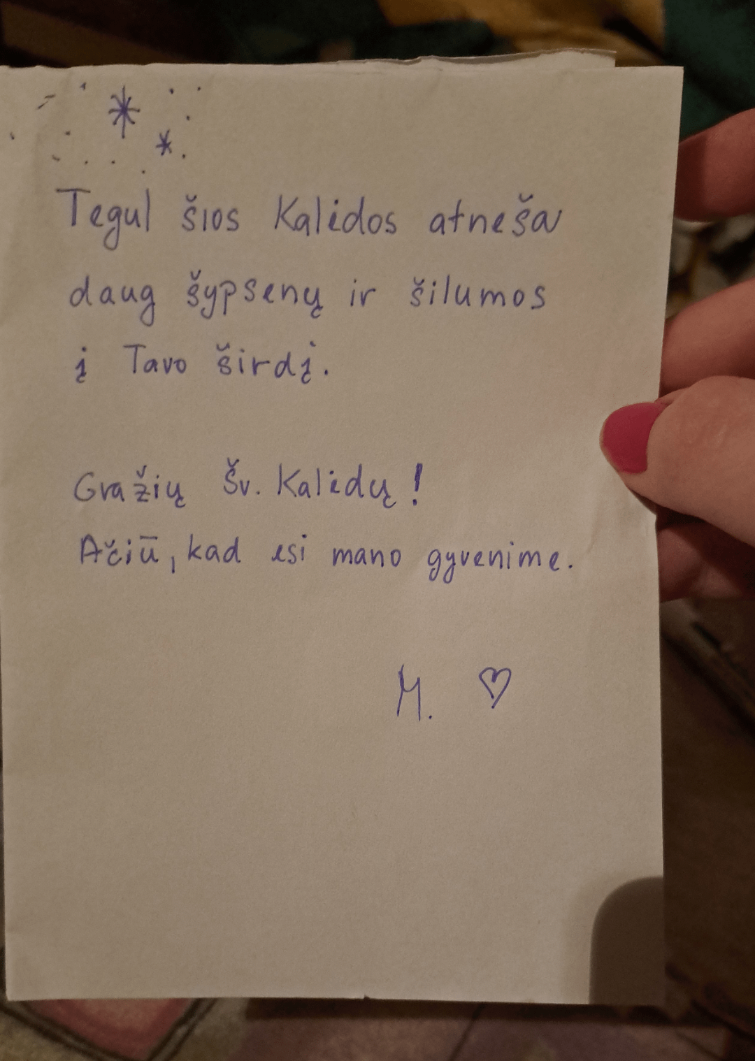 Hello, i have great lithuanian friend and i wanna send her postcard for christmas and some small gifts. I wrote christmas wish in my language and i found translation for the same text in lithuanian… Can you check if its really correct? .. And doesnt it sound weird for not formal communication? Plus.. Can you check my handwriting? In my alphabet, we dont have your special letters, so if i made any mistake, please, correct me. Thank you 🌸