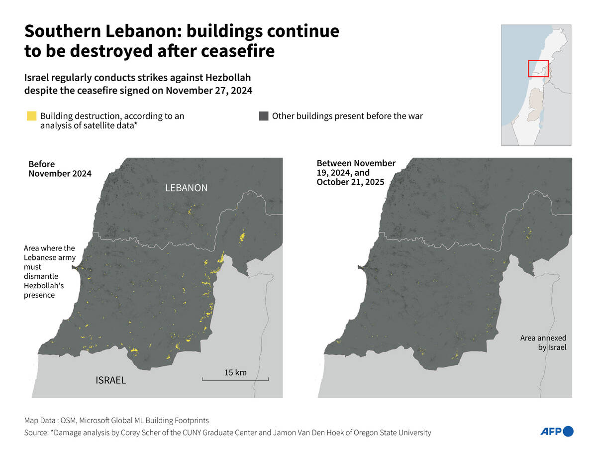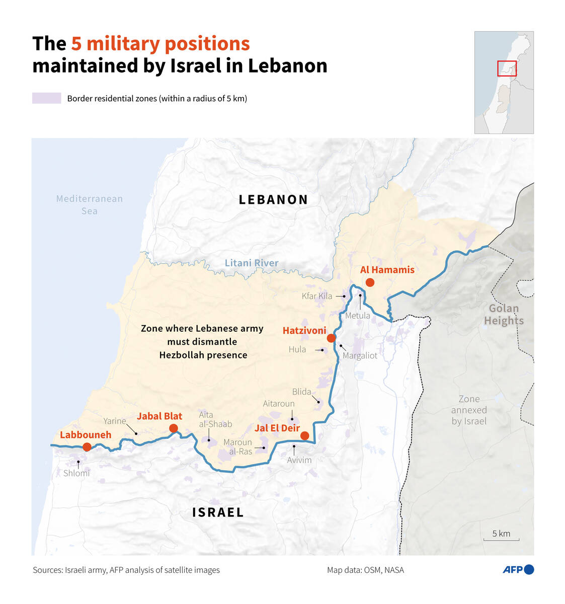 Neither party has yet fulfilled its obligations under the US- and French-brokered ceasefire deal, with Hezbollah failing to disarm and fully withdraw its fighters north of the Litani River and Israeli troops continuing to occupy five strategic hilltops on Lebanese territory.