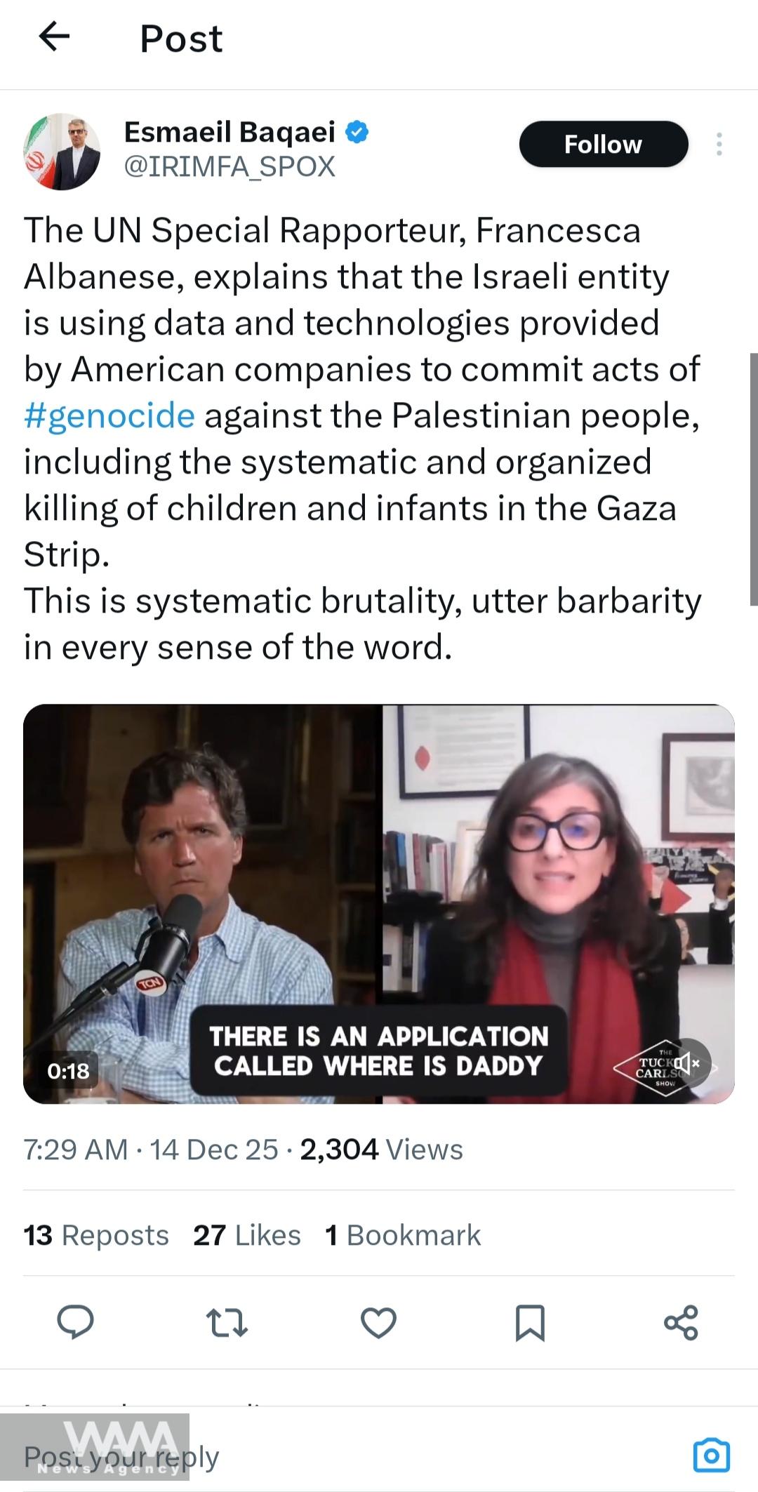 WANA (Dec 14) – The spokesperson for Iran’s Ministry of Foreign Affairs issued a statement criticizing what he described as the Israeli regime’s focus on the mass killing of children through the use of technologies and data allegedly provided by American companies.