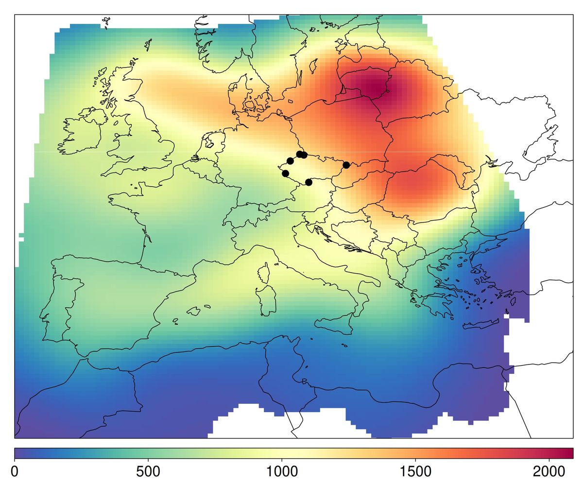 Oblasti původu síranů, které přicházejí ovzduším do Česka. Červená barva značí míru jejich koncentrace, černé tečky označují místa měření.