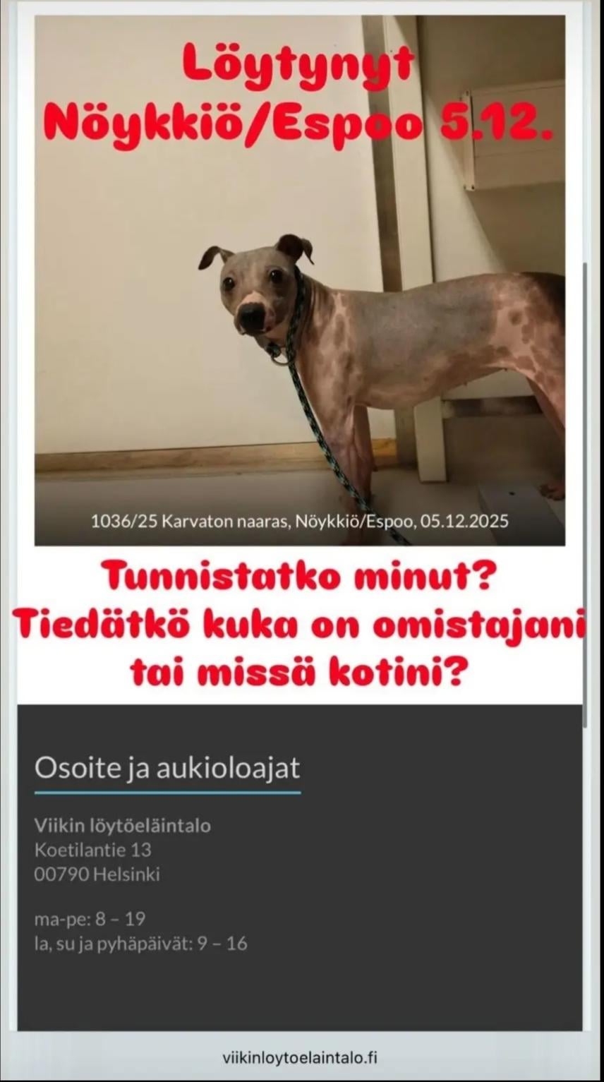 Right now at Viikin Löytöeläintalo. After 14 days of custody, she will become the animal shelter's property and they find her a new home.