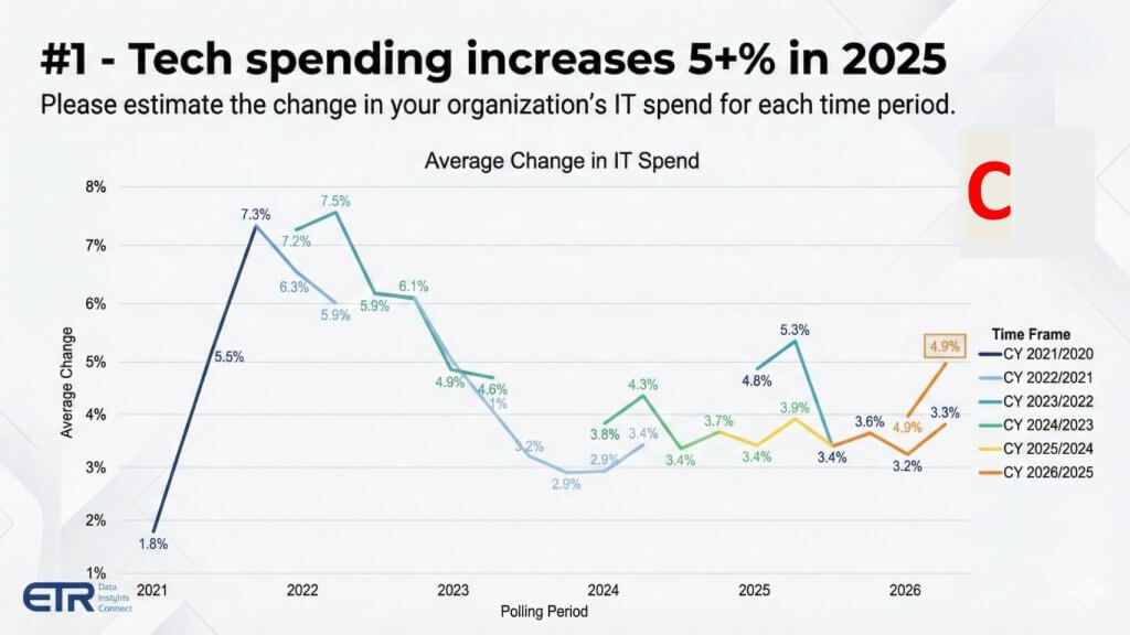 Now we’re entering 2026 with expectations around 4.9% or 5%. But we give ourselves a C here because we missed. Generally speaking, we think IT spending — budgets, as reported by IT decision makers — will come in at low single digits, roughly 3% to 4%.