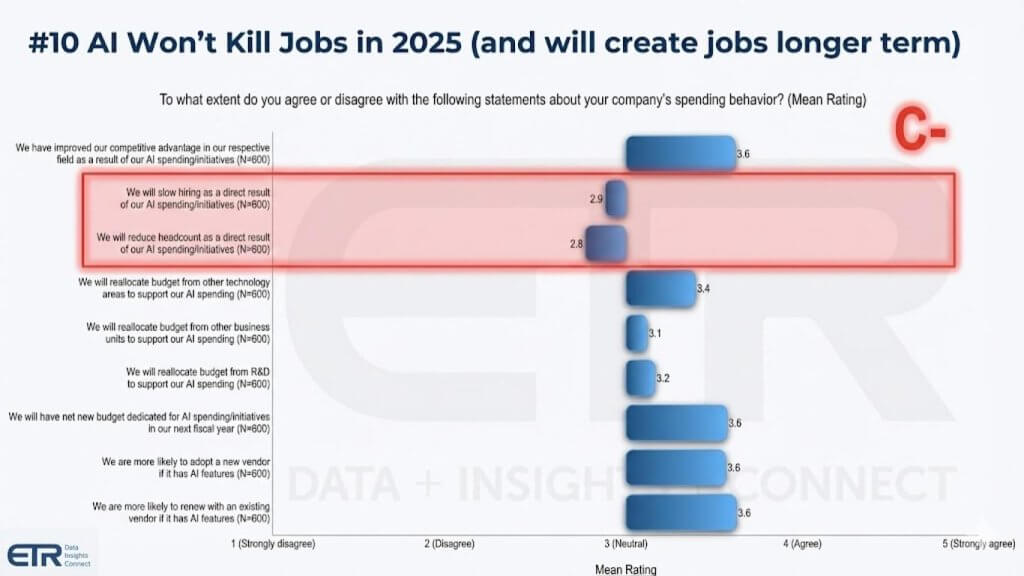 ETR survey results show small percentages saying they’ll slow hiring or reduce headcount as a direct result of AI spending. That was the expectation.