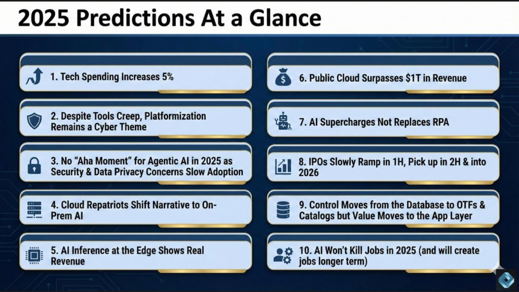 Below we show all of our 2025 enterprise tech predictions in one slide. They range from tech spending (we always do one there) to agentic artificial intelligence to cloud, and then markets, data and AI.