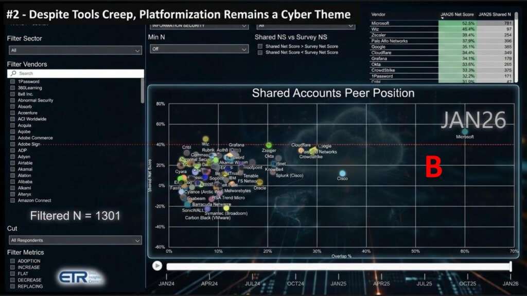 This is a quick snapshot from the January 2026 survey — preliminary data. The reason to focus on it is that red dotted line at 40%. Last year, more companies were above that 40% line — Zscaler Inc., Palo Alto Networks Inc., I think even Cloudflare Inc. Now they’re below it. Only Microsoft Corp. and Wiz Inc. are above that 40% line today.