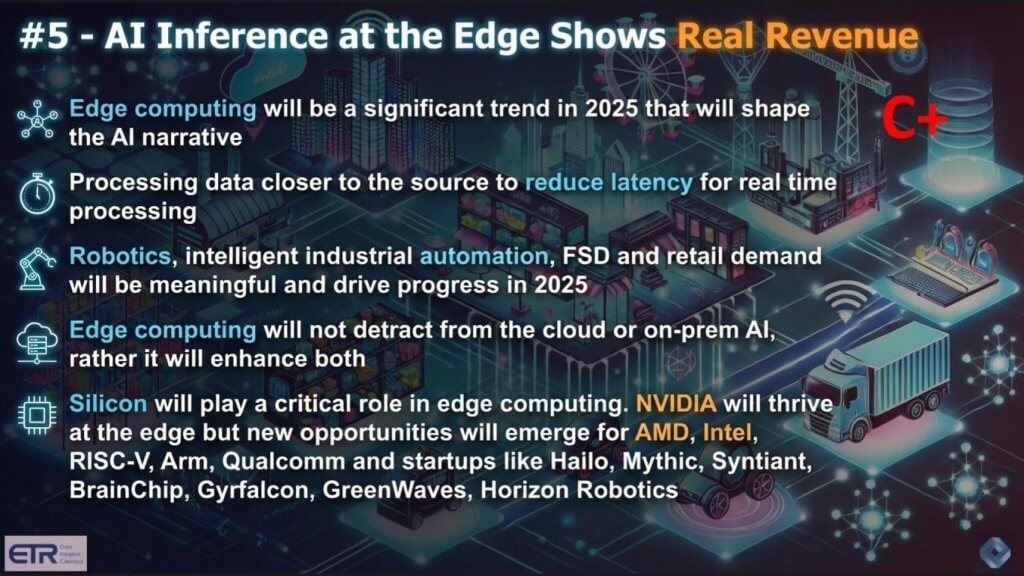 We said edge computing would be a significant trend in 2025. The narrative is definitely there. We’re seeing some deals — such as Nvidia Corp. with Nokia Corp. at the GPU Technology Conference in Washington, D.C. John Furrier has talked about hyperconverged at the edge and new architectures processing data closer to the source for latency. There’s lots of talk about robotics and physical AI.