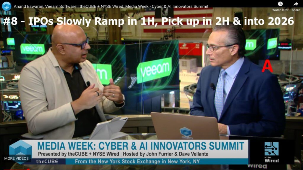 The IPO market was tepid in the first half. Activity picked up in the second half, with plenty of crypto activity. We’ve also had conversations such as the one with Veeam Software Group GmbH (above), which we expect to go IPO (not calling the exact timing yet). Companies such as Snyk Ltd.and Veeam are in the conversation. We’ll see about Databricks Inc. and Anthropic PBC — there’s a lot of talk, but we’ll judge that in our final predictions post.