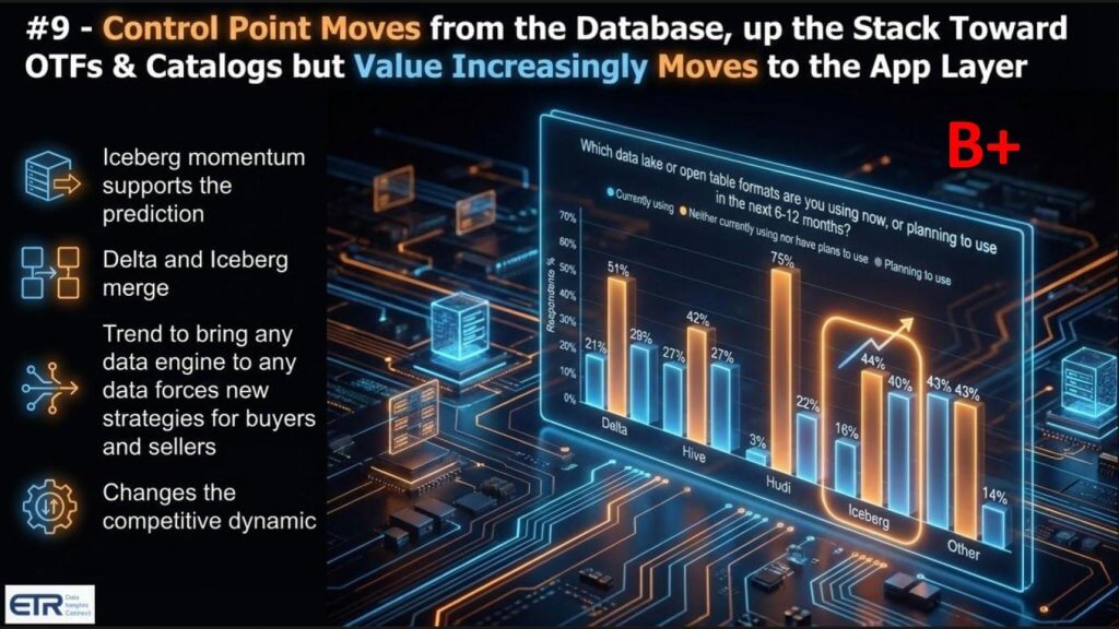 Prediction 9: Control point moves from the database up toward open table formats and catalogs, but value increasingly moves to the application layer (Grade: B+)