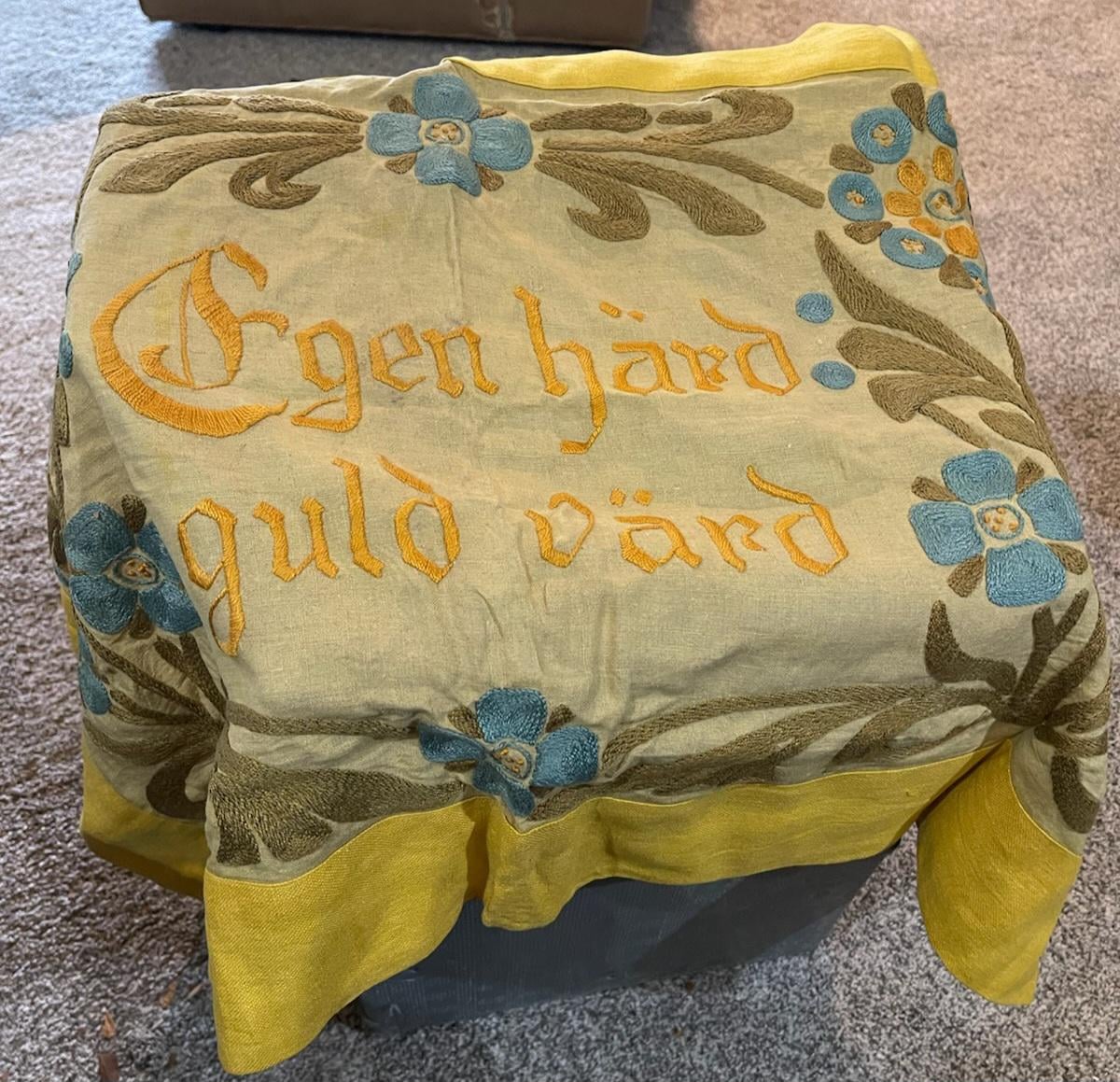 It says ”Egen Härd Guld Värd”, which kind of translates into ”Own hoard/hearth is worth gold”