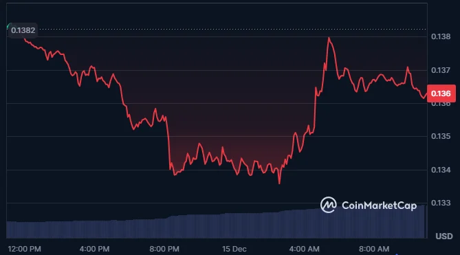 Following the initial breakdown, selling pressure began to diminish near the $0.1372 level. Subsequent price candles displayed progressively lower volume, suggesting exhaustion among sellers. The asset then formed a V-shaped recovery pattern, characterized by higher lows and stabilization near prior lows.