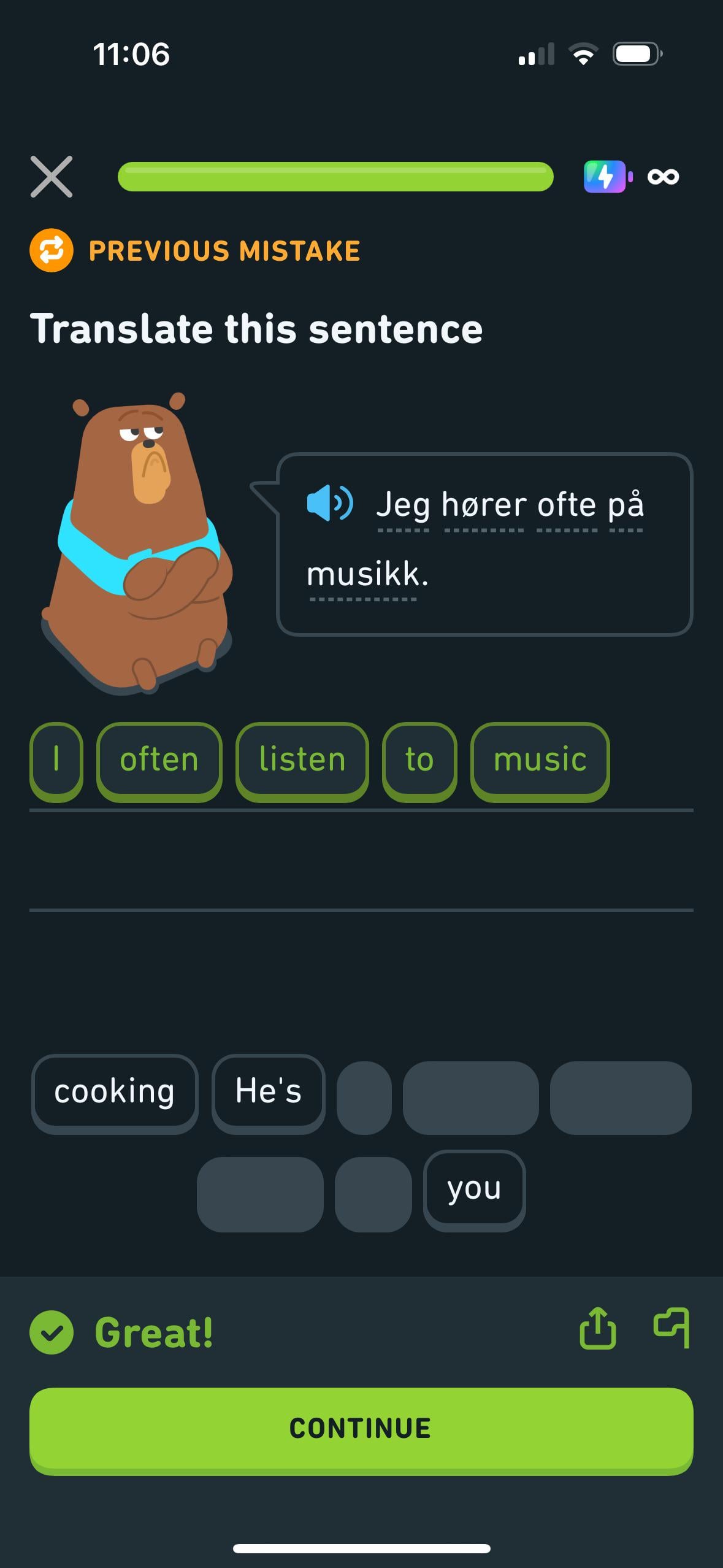 You’d probably say *”I listen to music all the time”* or *”jeg hører på musikk hele tiden”*.