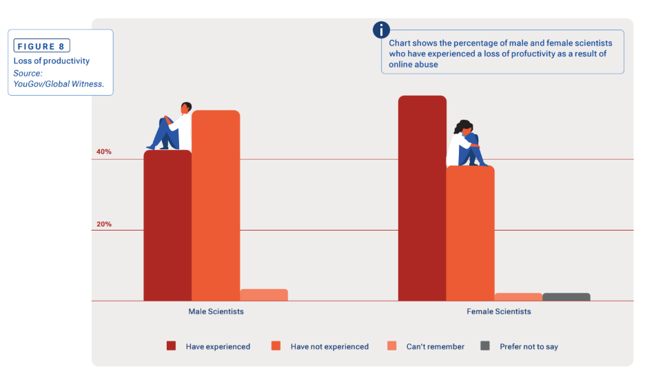 Loss of productivity. Figure shows the percentage of male and female scientists who have experienced a loss of productivity as a result of online abuse. Adapted from Global Hating: How online abuse of climate scientists hinders climate action.