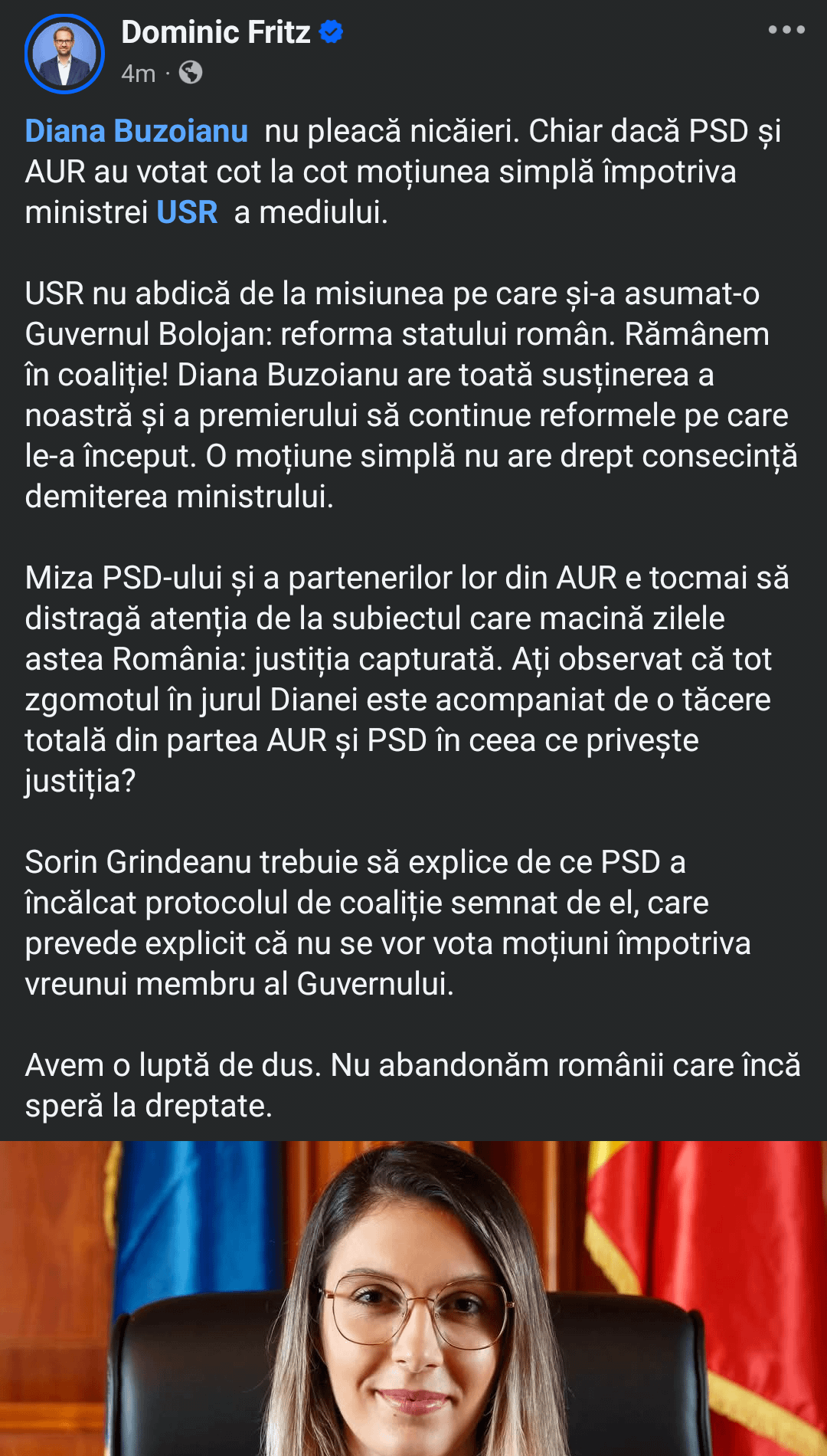 Fritz: Diana Buzoianu nu pleacă nicăieri! Sorin Grindeanu să de-a explicații de ce a votat cu AUR