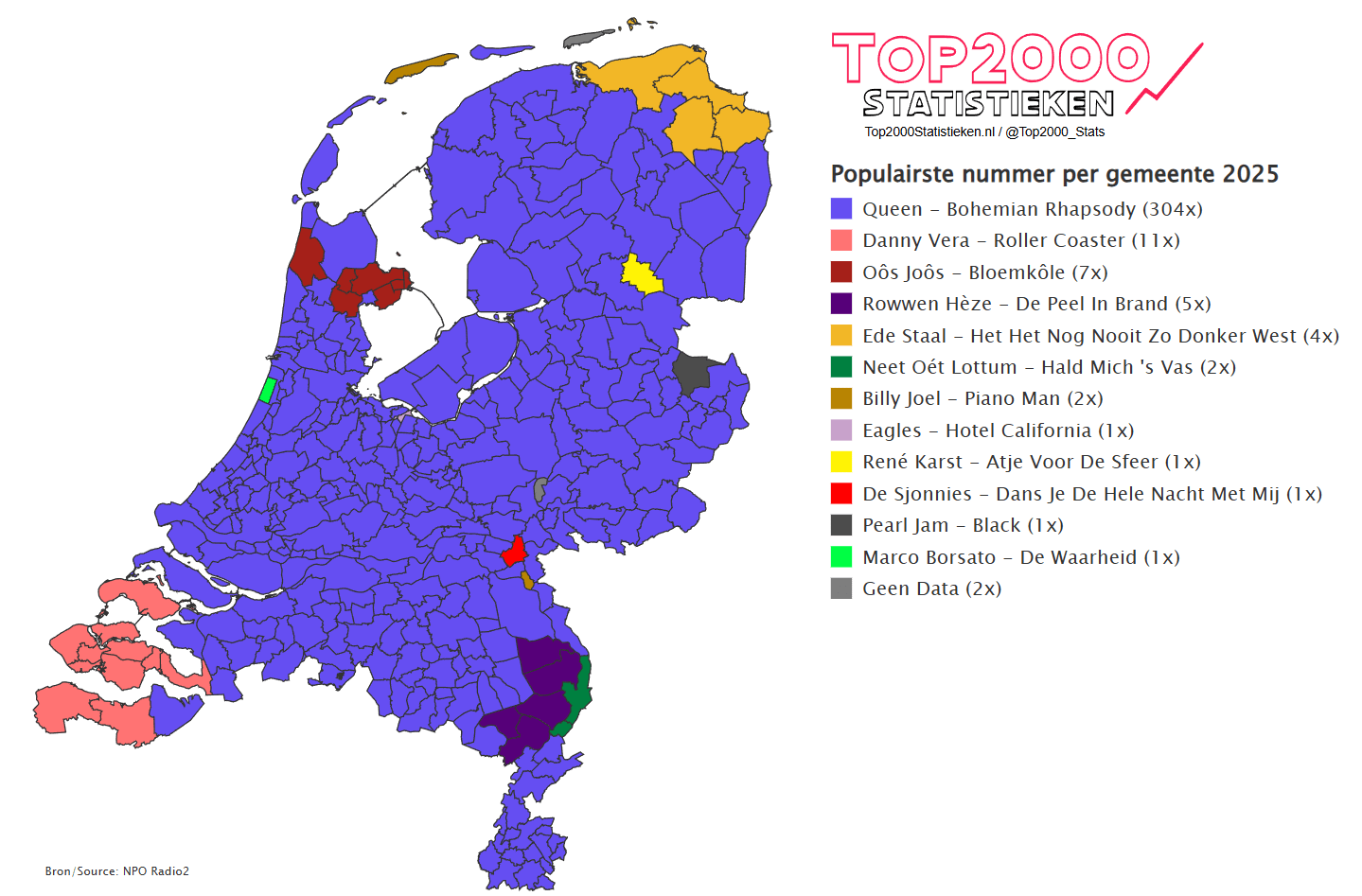 In bijna 90% van de gemeenten staat Queen op 1. Vooral in de regio zijn wat regionale artiesten te zien.