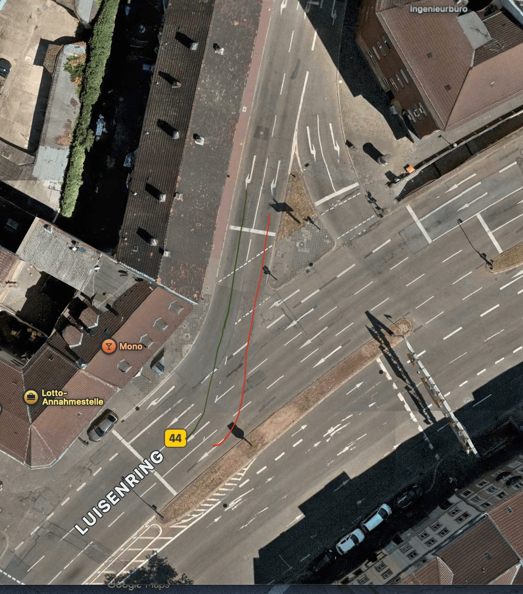 At around 10:20 PM, I was in the right lane of the two lanes entering the Luisenring. I stayed on my lane – I didn't cross over onto other lanes.