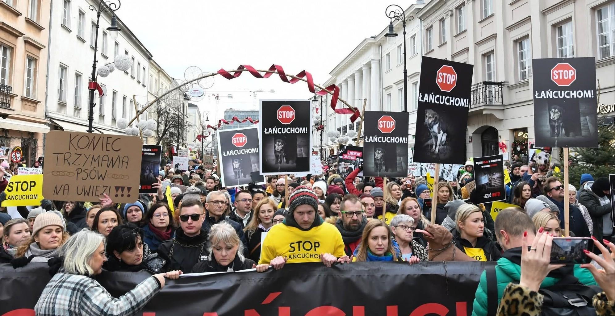 Thousands of people joined a protest in Warsaw on Sunday against President Karol Nawrocki’s decision to veto a law that would have introduced a ban on keeping dogs chained up.