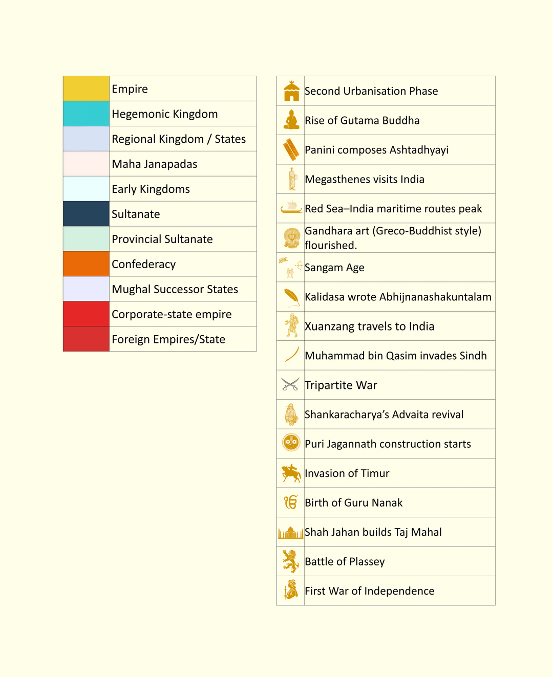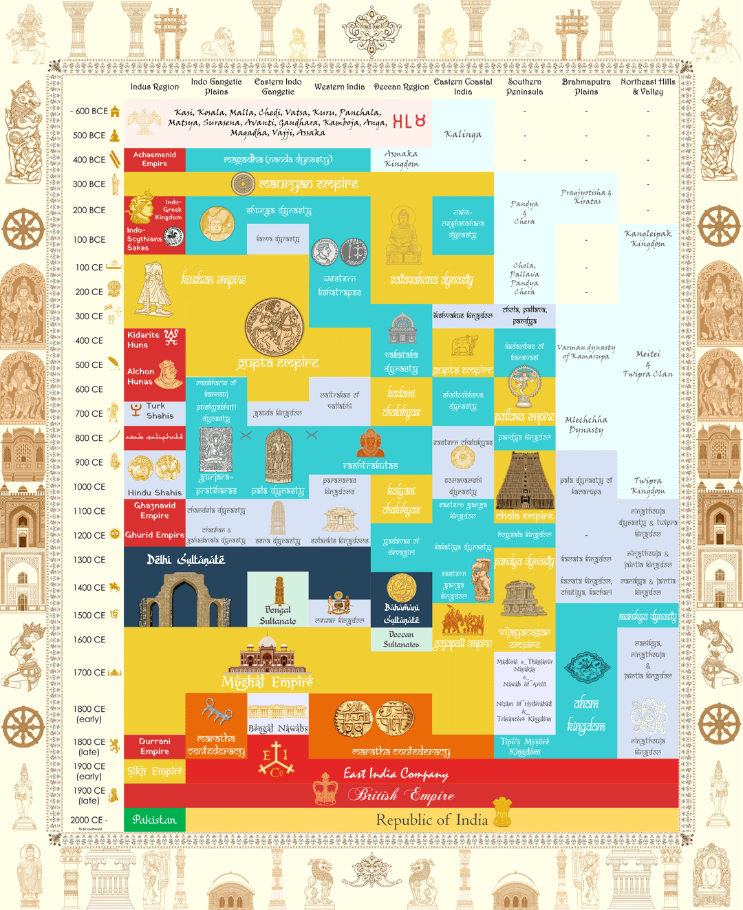 This graphical timeline is a simplified and interpretive representation of historical periods and regional prominence of various kingdoms and empires in the Indian subcontinent. The timelines and territorial extents of only prominent kingdoms and empire shown are approximate and have been presented for visual clarity, with overlapping polities and concurrent powers intentionally omitted. The content is indicative, partly speculative, and based on secondary sources and general historical literature consulted through a desktop study. It is not intended to serve as an academic, authoritative, or legally verified record, and viewers are advised to refer to primary sources and established scholarly works for precise historical information. This work includes AI-assisted edits and vectorisations of non-copyright, public-domain images solely for illustrative purposes.