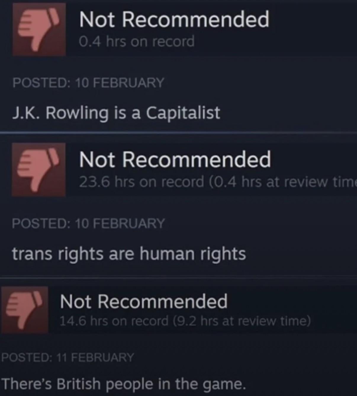Bruh, this is wild. People really out here giving “not recommended” to literally everything they disagree with? Like, J.K. Rowling is problematic to some, trans rights are human rights—but nah, gotta hate on both just ‘cause. Feels less like honest reviews, more like pettiness. Steam reviews turning into a battlefield smh.