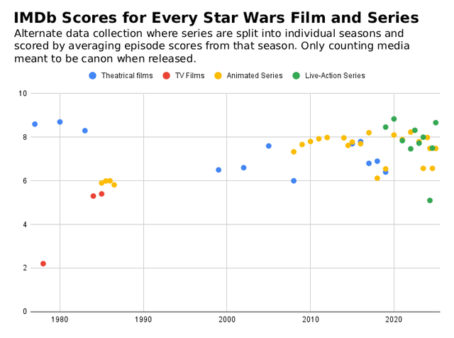IMDb Scores for Every Star Wars Film and Series [OC] Posted by DataSittingAlone Tags:DataData Is BeautifulDataIsBeautiful 8 comments Data from IMDb and Wikipedia. Made with Photopea and Google Sheets Is the red dot from pre-1980 the cursed Christmas show? I’m shocked ‘Rise of Skywalker’ isn’t lower. I’m a 4>5>6>1>3>2>7>8=9 kind of guy What’s the fourth one around the 2000-2010 area? I don’t remember any other than the three prequels So… Holiday Soecial or Ewoks something is the worst ever, even below Book of Boba Fett? What about the 2D Clone Wars series from the early 2000s? Could you explain how for example you have a yellow dot at around 5.5 in 2018 but all the yellow dots in the alternate chart are above that? Comments are closed.