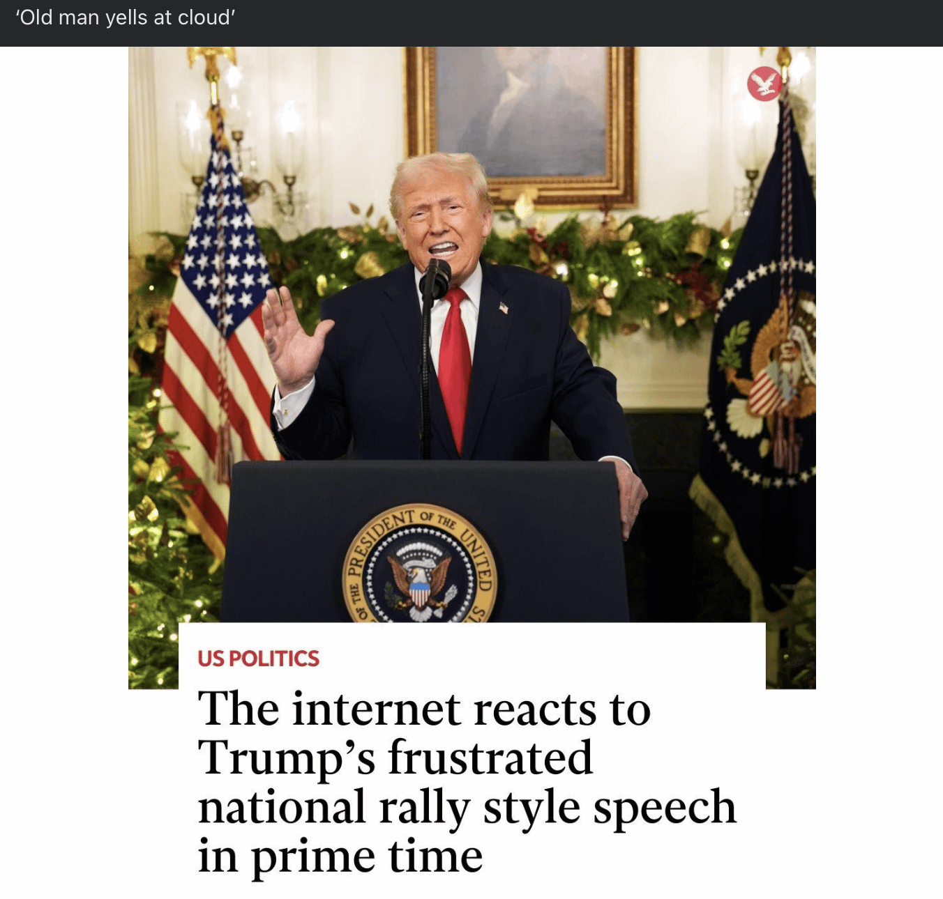 The news media needs to fucking stop sane washing his speeches. Almost every outlet has covered his speeches in a polite manner and acts like he has made coherent points based in reality. Yes, they often fact check him but they still treat his “speeches” like they were not just angry drug addled fever dreams.