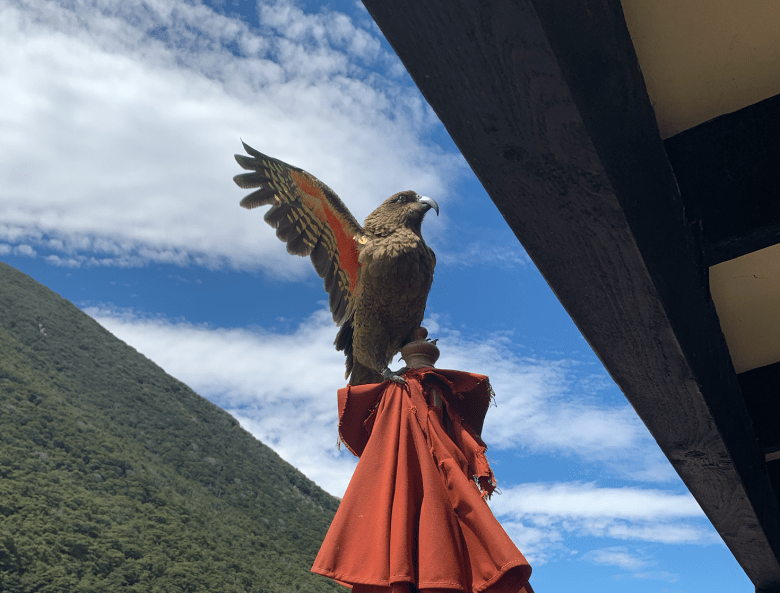 A kea prepares to take off from an umbrella in Arthur’s Pass, a popular sight for tourists. Photo: Fox Meyer