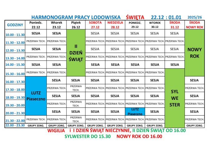 Poniżej zamieszczamy harmonogram pracy Lodowiska w okresie świątecznym. Serdecznie zapraszamy!