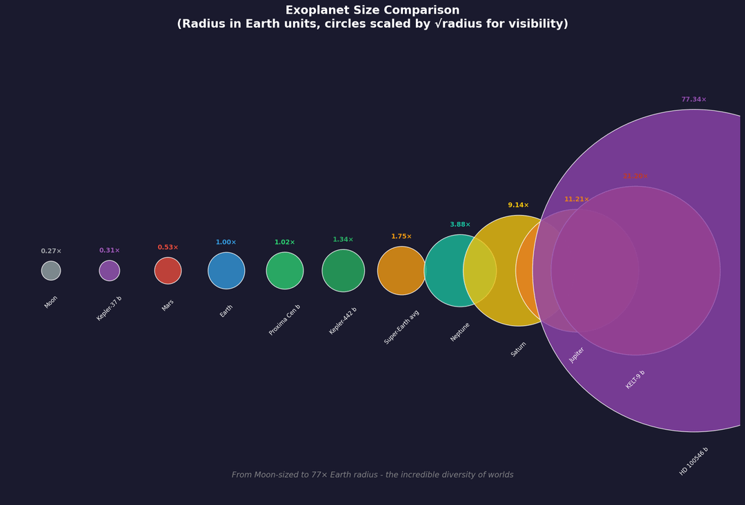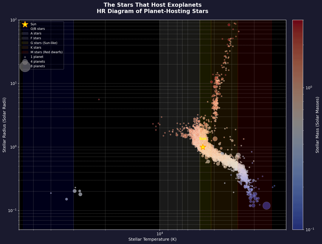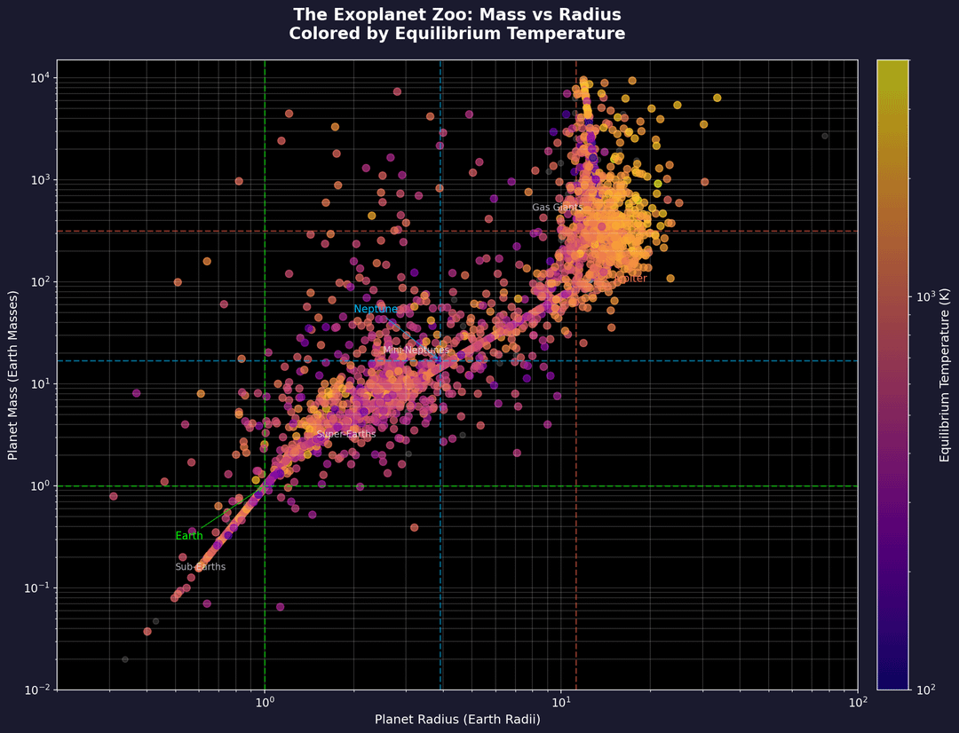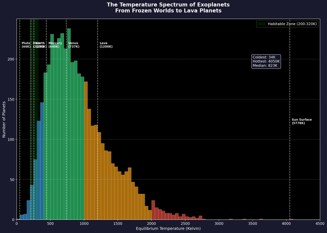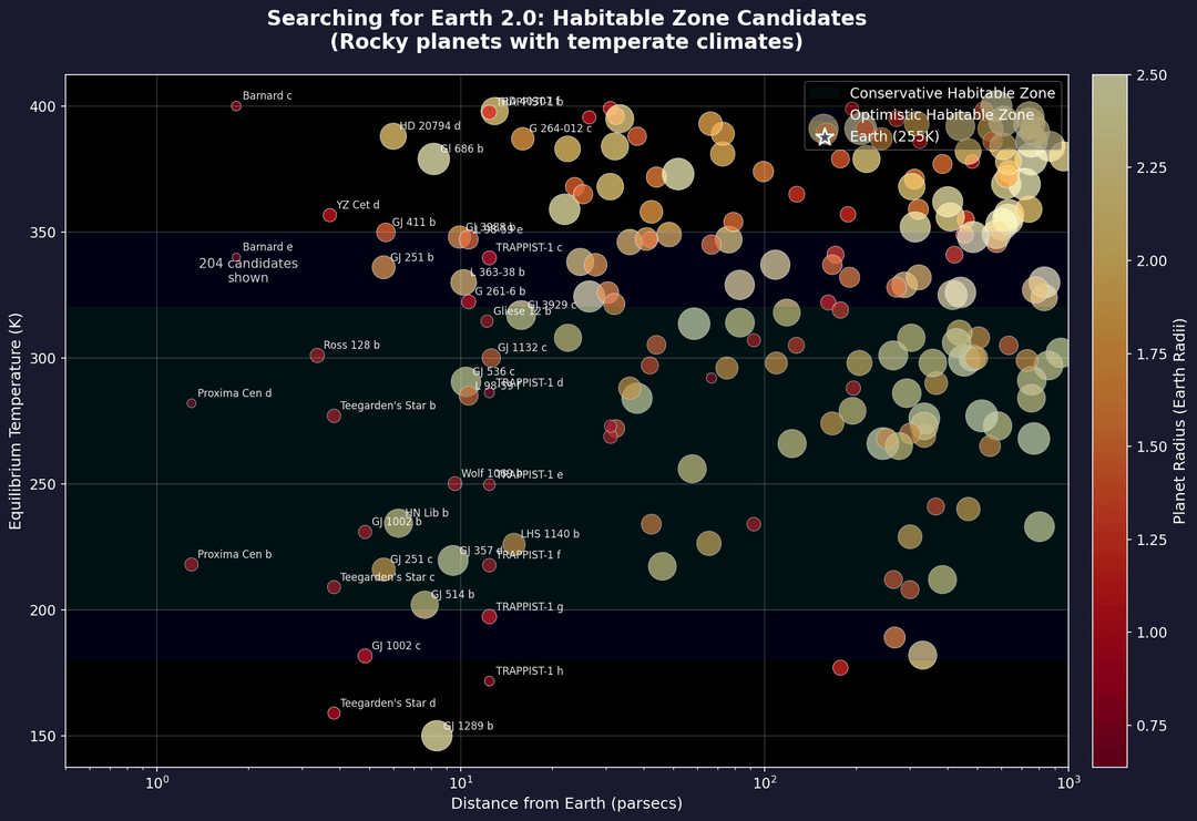 – 25 Goldilocks Candidates: Only 25 planets have both Earth-like size (0.8-1.5 R⊕) AND temperate temperatures (200-320K). This is just 0.4% of all known exoplanets.