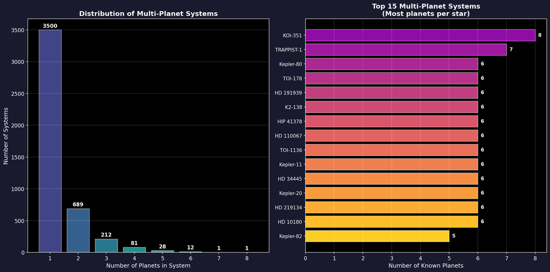 – Transit Method Dominance: 73.8% of all exoplanets were found via the transit method (detecting starlight dips as planets cross their stars). Radial velocity is a distant second at 19.1%.