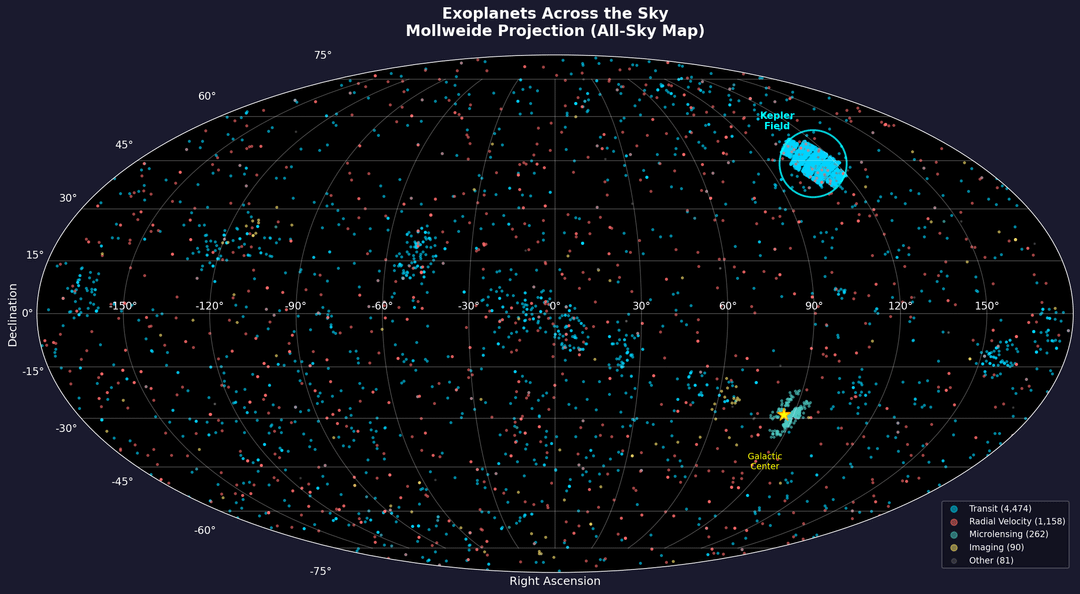 – The sky map shows a dense cluster in the Cygnus constellation / Kepler's fixed viewing area. Most "known" exoplanets are in one small patch of sky.