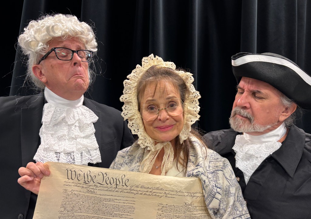 From left: Dana Olsen as Thomas Jefferson, Victoria Zielinski as Abigail Adams and Paul Barrosse as John Adams in the Practical Theatre Co.’s new revue, Quick! Before We’re Cancelled!!! Credit: Béa Rashid