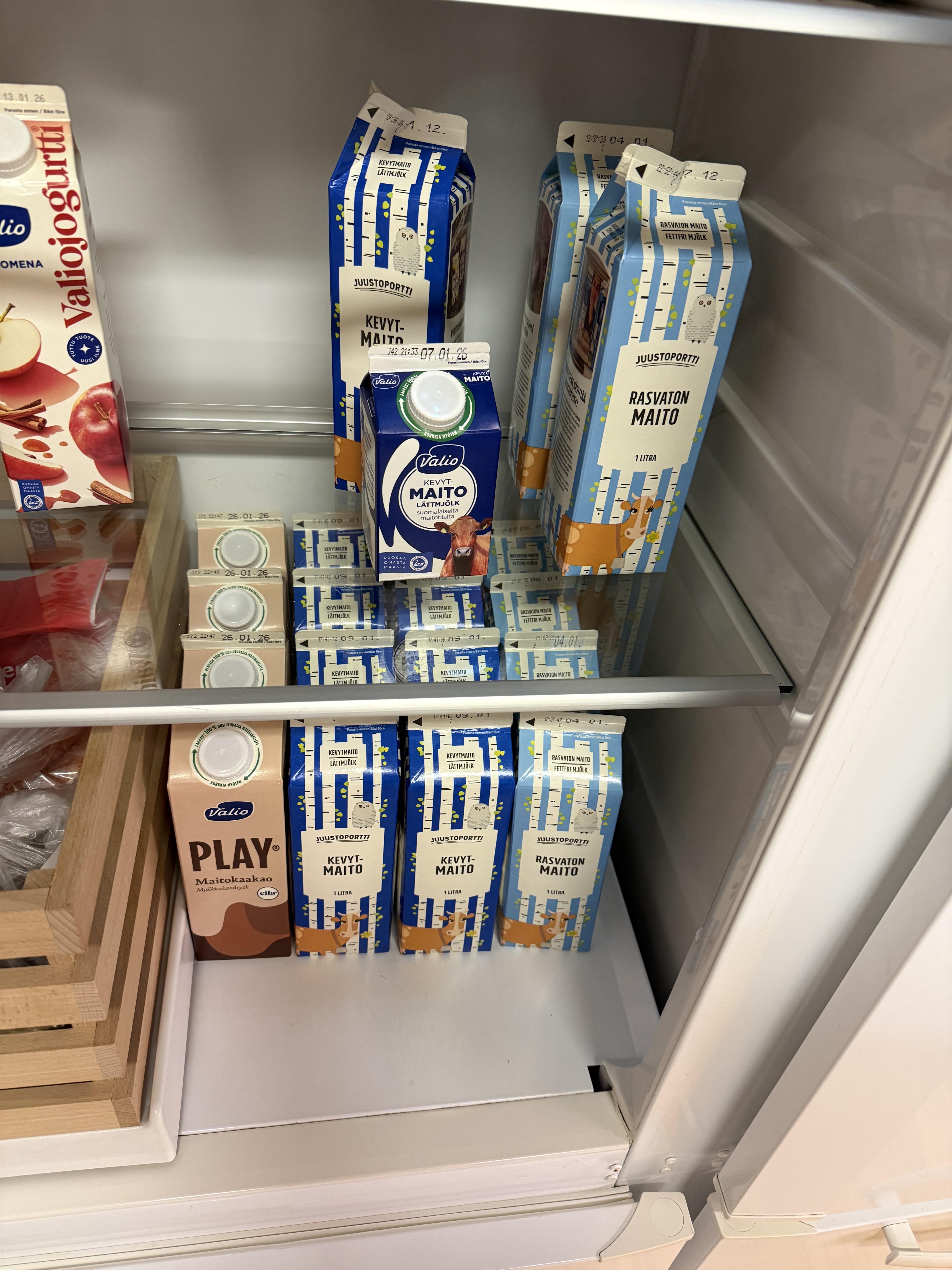 All of this milk is for preparing the dishes for the Christmas table for 3-4 people, and the chocolate milk is for drinking. I don’t really drink milk myself but my partner, her mom, and her sister drink it with their meals, and they use a lot of milk for baking and cooking the various foods and desserts for the Christmas table. No judgement at all but every time I’m here in Etelä-Pohjanmaa for Christmas I’m a little shocked by the amount of milk in the fridge 😂.