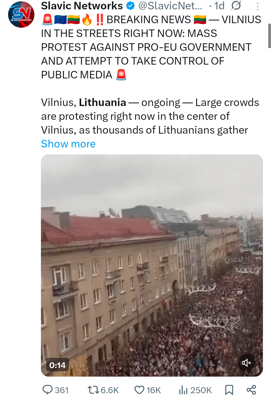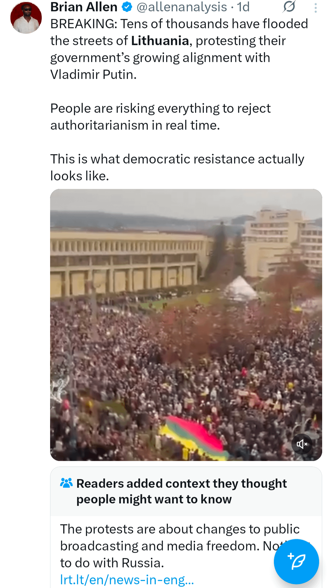 3 iš jų meluoja, kad čia prieš pernelyg proeuropietišką/antirusišką žiniasklaidą protestas. Nei vienas neturi community note.