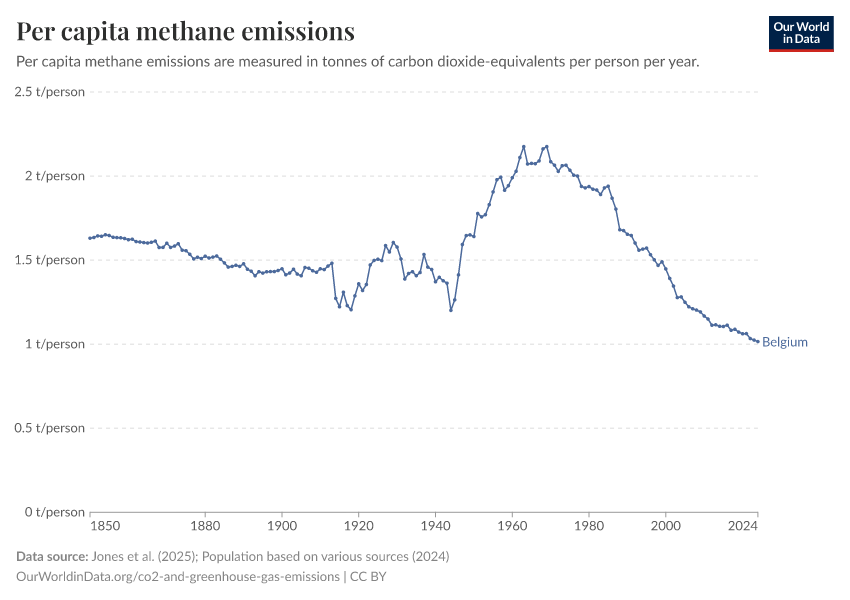 This first interactive chart here shows per capita emissions of methane each year. This is measured in ‘carbon dioxide equivalents’.
