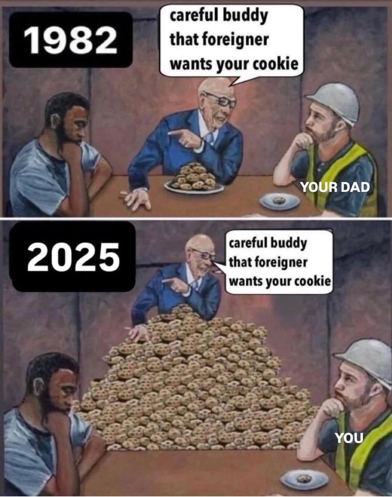 It would be more accurate if he was telling the construction worker to give the foriegner his cookie while using the foriegner to steal more cookies from the worker.