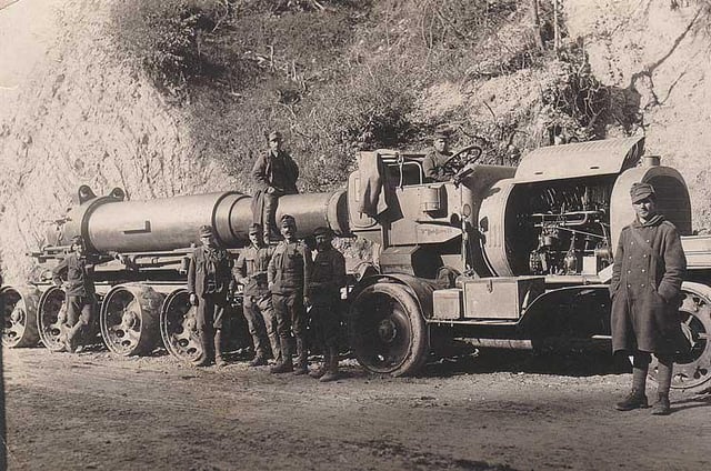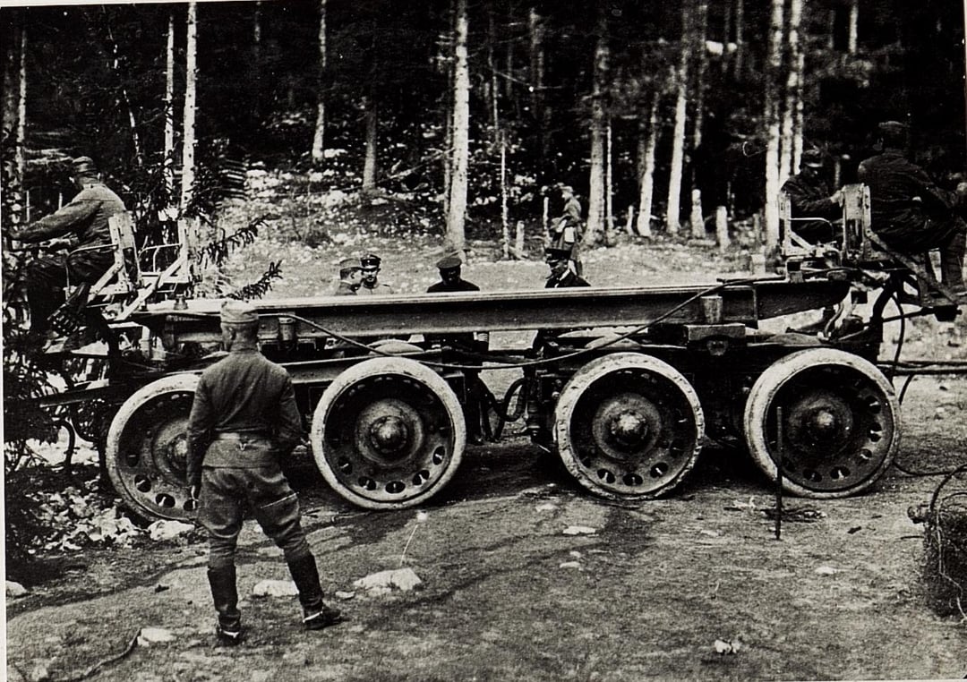 Škoda je zahteval, naj bo havbica enako mobilna kot skoraj štirikrat lažji možnar *M. 11*, ki je tehtal »le« 20.900 kg. Ponovno je na pomoč priskočil Ferdinand Porsche iz tovarne *Österreichischer Daimler Motoren AG*. Havbico so prevažali razstavljeno na štirih prikolicah: prikolica s cevjo in zaklepom je tehtala 38 ton, prikolica z lafeto in zibko 33 ton, prikolici z obema polovicama škatlastega podnožja pa 36,6 ton in 37,6 ton. Štiriosne prikolice, imenovane *Elektro-Fahrgestell M. 16*, so prazne tehtale 15.600 kg (po nekaterih virih 15.000 in 15.400 kg). Vsaka os je imela svoj elektromotor moči 15 KM. Vsaka prikolica je dobila svoj vlačilec *Artillerie-Generatorwagen M.16* (*Generatorzugwagen M. 16*). Izraz vlačilec ni povsem primeren, saj vozilo ni vleklo prikolice, pač pa je šestvaljni bencinski motor z močjo 150 KM in prostornino 20,3 litrov poganjal agregat, ta pa je z elektriko napajal elektromotorje na zadnji osi vlačilca in vseh oseh prikolic. Prikolico je bilo možno odklopiti od vlačilca in jo voziti samostojno, vlačilec pa je elektriko dovajal preko kabla. To je bilo uporabno na ostrih ovinkih ozkih gorskih cest, ki jih sklopljena vlačilec in prikolica ne bi mogla zvoziti. Celotna cestna kompozicija je tehtala 145,2 tone. Dodatne prikolice so nosile granate, vsaka po 20. Po pravilu je vsaka od prikolic dobila svoj vlačilec, vendar je na dobrih cestah in pri majhnem naklonu en vlačilec lahko poganjal dve prikolici. Z eno prikolico je vlačilec dosegal največje hitrosti 14-16 km/h in premagoval klance z naklonom največ 26 %. Z dvema je hitrost padla na 12 km/h, klanec pa je bil lahko največ 20 %. Na najstrmejšem možnem klancu je lahko vozil 1,35 km/h. Na tipičnih cestah zmerno hribovitega terena je vlačilec vsakih 100 km porabil 300 litrov bencina in 14 kg motornega olja.