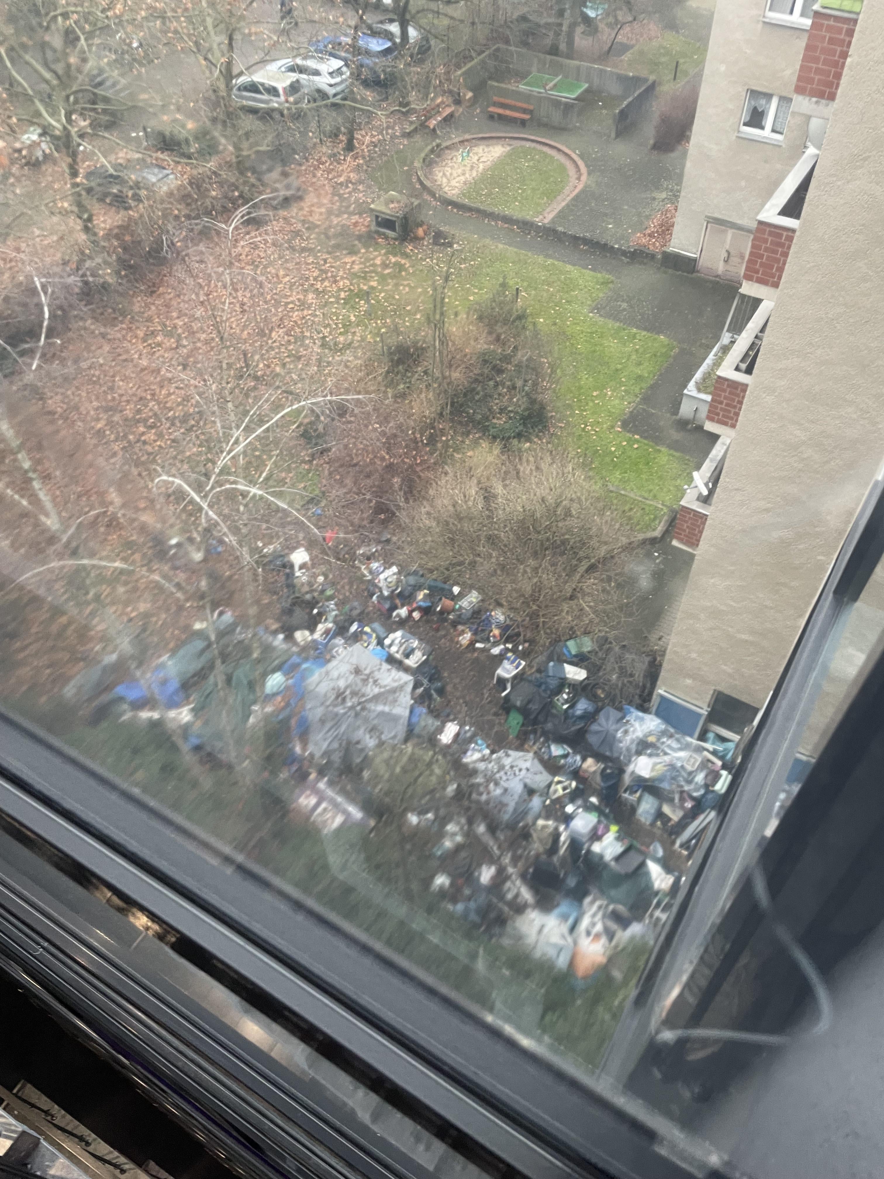 Wohl eher der Lagerplatz eines wohnungsgeräumten Obdachlosen. Wenn der Besitzer des Grundstücks nicht eingreifen mag, ist das wenn überhaupt ein Fall für den psychosozialen Dienst, die Müllabfuhr wird nicht eigenmächtig Zeug entfernen, welches nicht zweifelsfrei aufgegeben wurde.