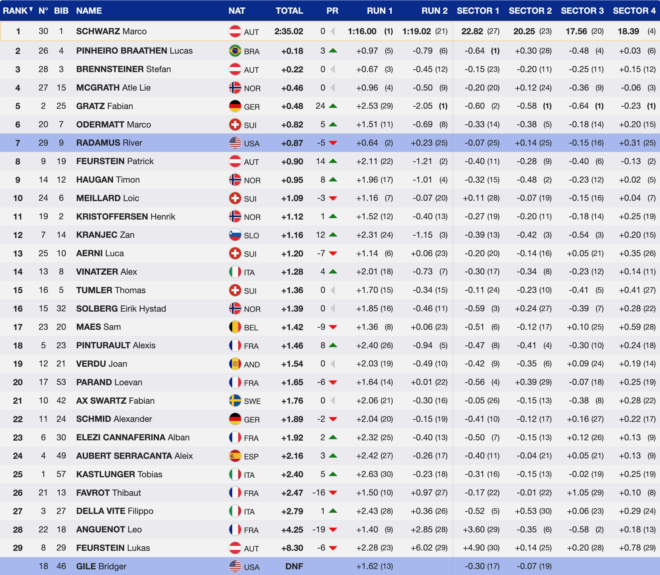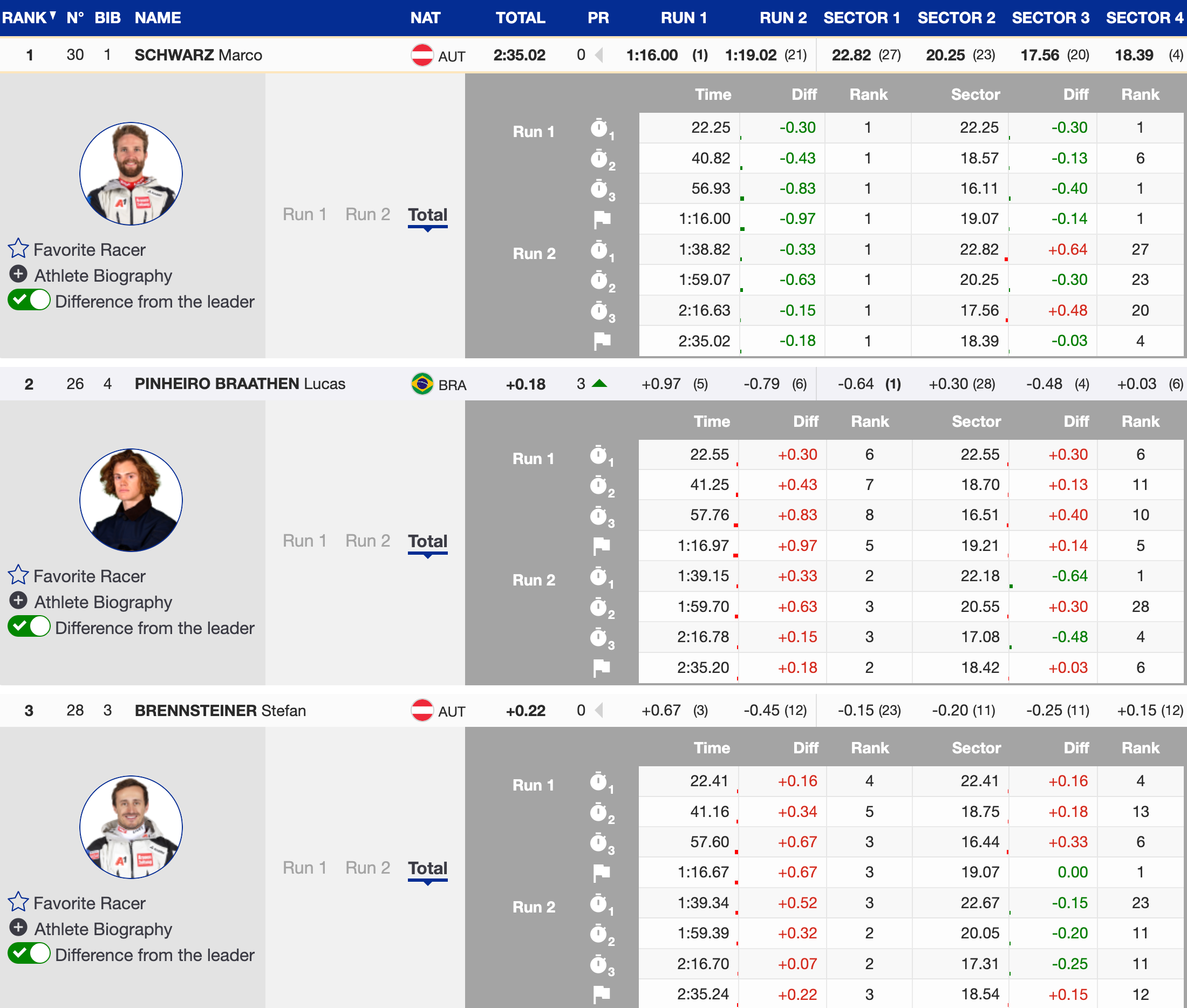 Reflecting on his decisive second run, Schwarz pointed to instinct and patience as the key. “It was a tough fight. There were a couple of gates that were a little bumpy, but the rest was really good. I tried to focus on my instinct and let the skis run.”