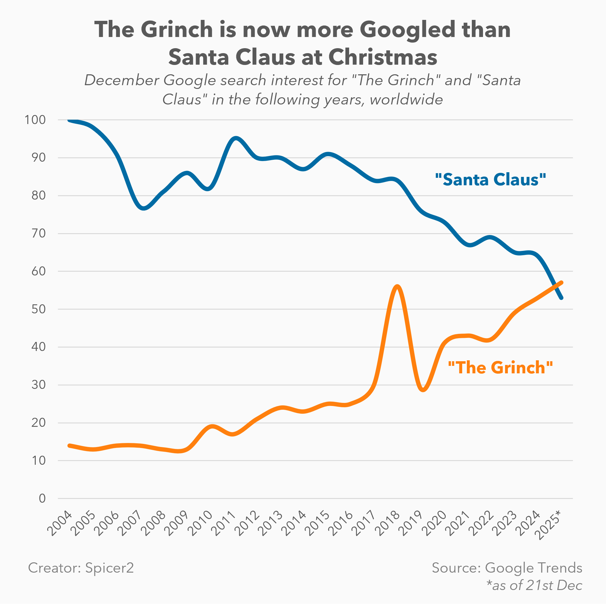 I’ve noticed The Grinch crop up in quite a few marketing campaigns this year, and I realized sometime since the pandemic the character has become almost inescapable across billboards and social media algorithms. I sense-checked this with Google search traffic and sure enough, this year represents the point where he’s now searched more than Santa Claus himself across the world (in the UK and US, the Grinch already leads). The Grinch might have actually stolen Christmas after all.