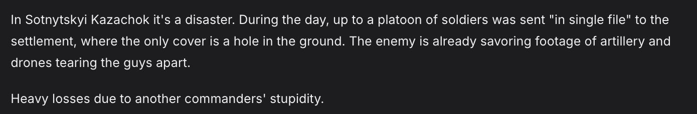 This is probably what the Russian milbloggers were harping on recently. They were lamenting the loss of an entire platoon that marched single file straight into a killzone and were torn to pieces by drones and artillery.