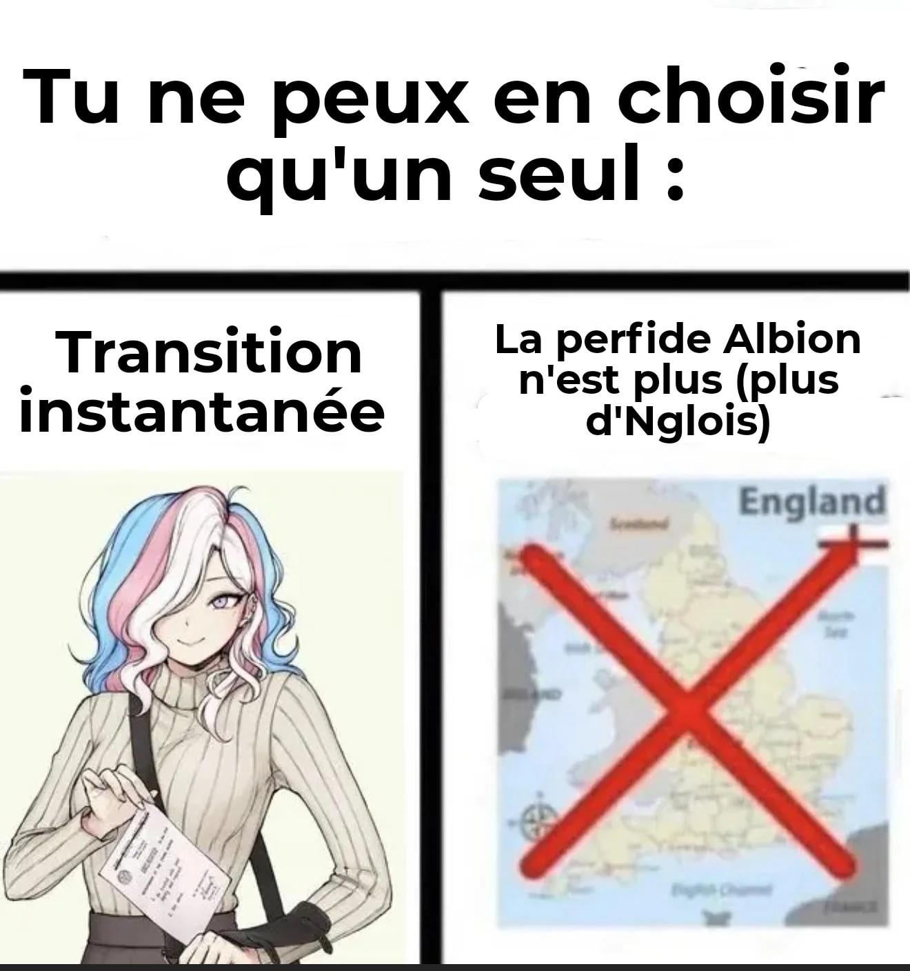 Je me dis, on est Rance ici et pas en Rans donc statistiquement il y a des personnes cis qui choisiront de détruire la perfide Albion donc je peux avoir ma transition parfaite sans crainte: Albion brûlera quand même