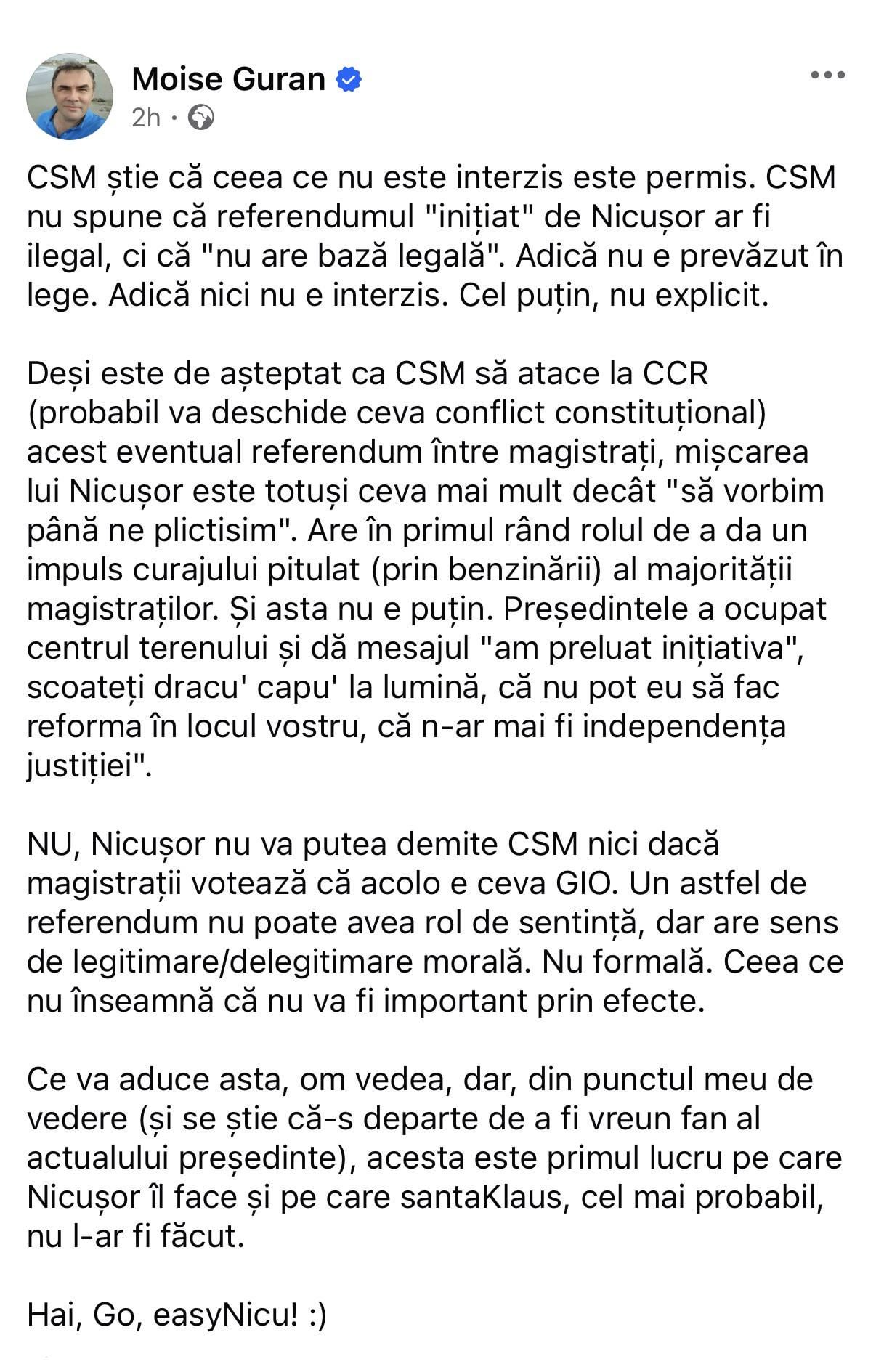 Președintele a fost extrem de neinspirat cand a dat denumirea de referendum la ceea ce este de fapt un chestiinar de sondaj. E limpede ca CSM a speculat denumirea asta greșită, dar era limpede ca o vor face, de-aia trebuia facut mai clar ce isi propune președintele sa faca. Un sondaj nu poate sa fie fara baza legala ca e doar un cacat de sondaj. Referendumul trebuie sa aiba o baza legala dar ar trebui sa aibă si consecințe concrete. Intrebari de genul “schimbam constituția in forma descrisa mai jos sau nu?” nu chestii la modul “va place constituția?”