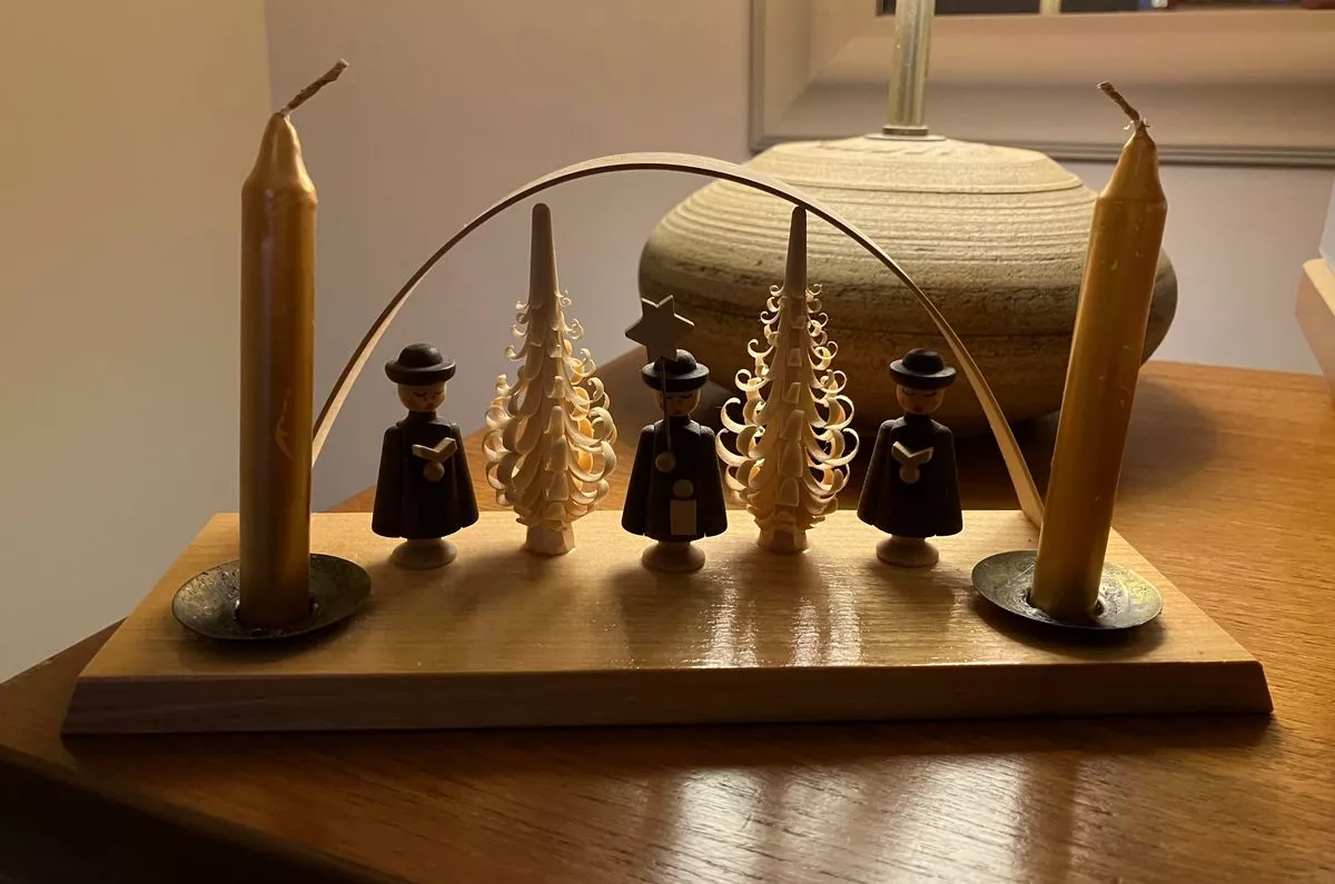 Each Christmas, we dust off a little wooden candleholder depicting three choir boys and two Christmas trees and position it on the windowsill. Carved in East Germany, it is stamped with the letters ‘GDR’ – German Democratic Republic.