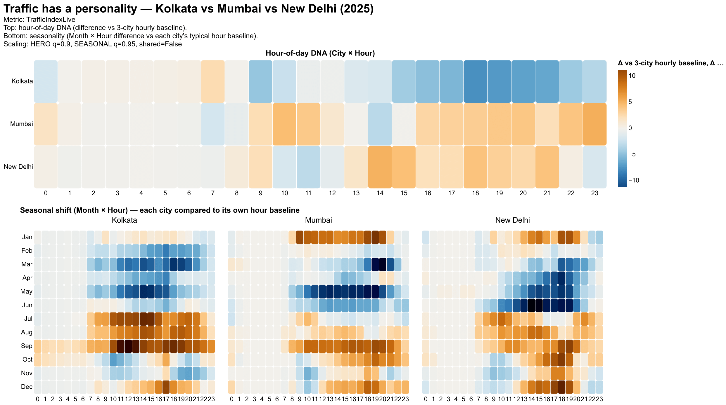 After going through so many beautiful posts on this subreddit, here is my attempt at creating one. I analysed hourly traffic data for Kolkata, Mumbai, and New Delhi across 2025 (updated till the early hours of December 22, 2025) to see whether congestion behaves the same way everywhere — or whether cities have distinct “rhythms.”Â