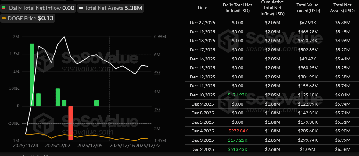 Current Dogecoin ETFs have struggled to attract investor interest since their late November debut. Data from SoSo Value reveals a troubling trend: the funds recorded eight consecutive trading days with zero inflows starting December 11.