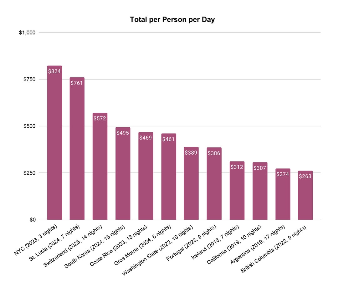 I've been tracking how much my husband and I spend on travel since 2018. I've only included "big" trips here, not included are local trips, trips with a specific purpose (e.g. traveling for a wedding), trips to visit and stay with family, trips that are not with each other, and business trips.